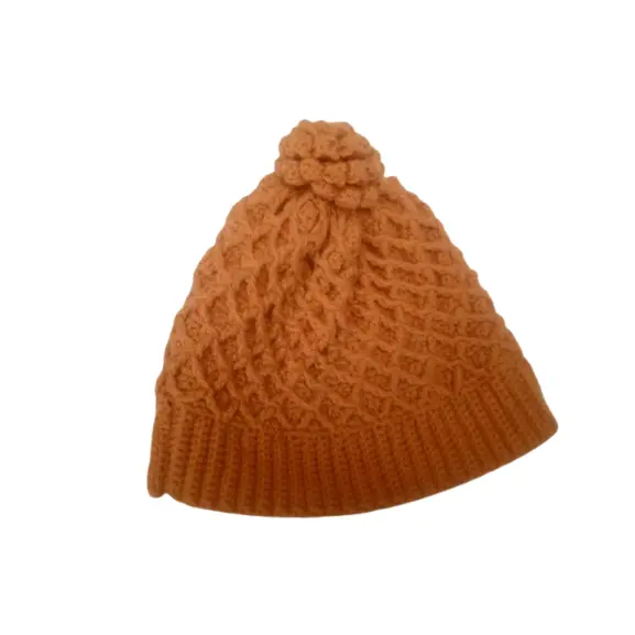 A knitted, handmade beanie crafted in Rwanda with a unique twist design and a soft pom-pom. Perfect for warmth and everyday style.