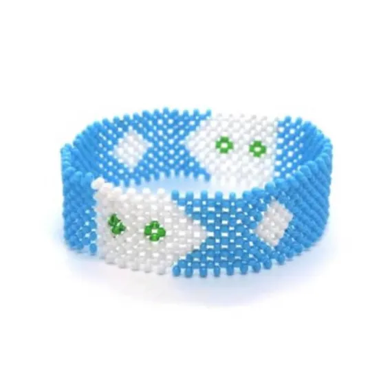 Add a pop of personality and handmade charm to your accessory collection with the Ocean Breeze Diamond Beaded Bracelet. Crafted using the intricate peyote stitch technique, this vibrant bracelet features a bold blue and white diamond pattern accented with striking green beads—perfect for everyday wear or gifting someone special.