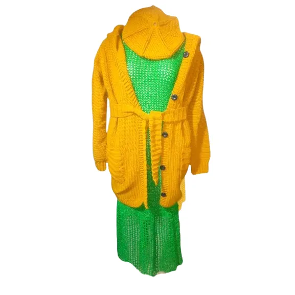 This stylish handmade knitwear set features a vibrant yellow cardigan with buttons and a waist tie, paired with a matching cap. Underneath is a beautifully crocheted green dress, offering both comfort and elegance.