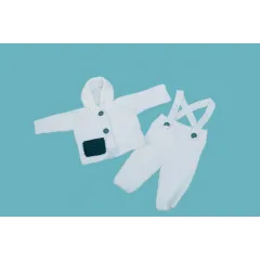 This charming hand-knitted baby outfit set features a cozy hooded jacket and matching overalls, crafted in a classic white. The jacket includes a dark blue pocket detail and buttons for easy dressing. The overalls have adjustable straps and a comfortable fit, perfect for your little one....